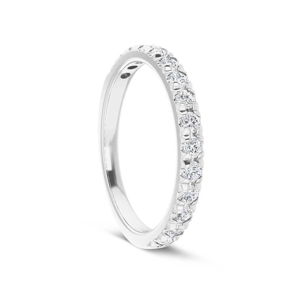 This classic french-set ring features 15 dazzling round Moissanite stones along the top half of the band. Each stone is set in sculpted prongs that blend into the sides of the band. Made in our Signature Sterling Silver, this ring has a similar appearance and durability of 14K white gold ring at an affordable price. With a brilliant white appearance and magical sparkle this ring is a wonderful complement a variety of engagement rings.